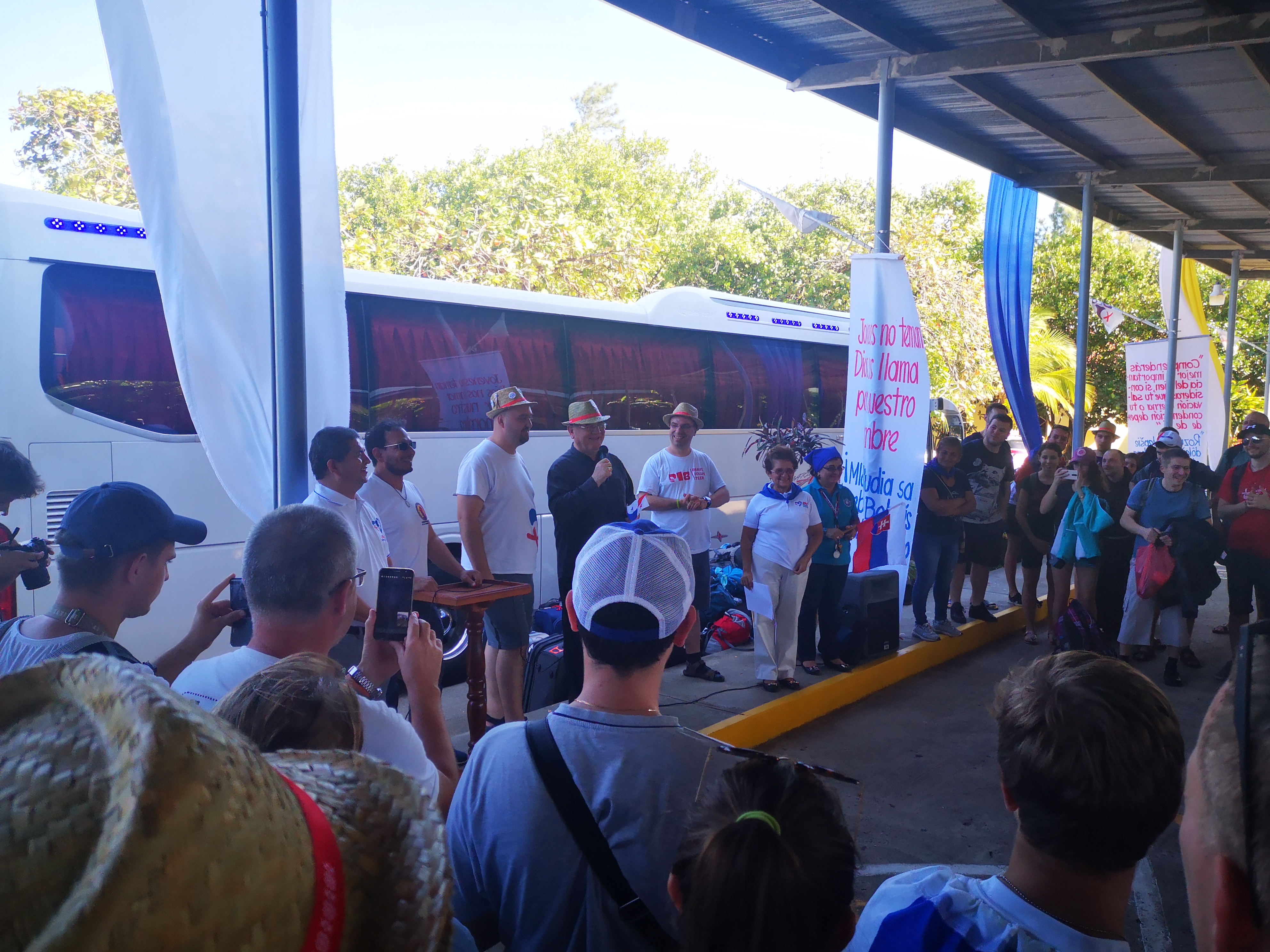 Santiago de Veraguas 17. januára 2019 – Spev, hudba a nadšené ovácie nás čakali po príchode do mesta Santiago de Veraquas, kde sa najbližšie dni zapojíme do Dní v diecézach. Prišlo nás okolo 130, ďalší sú ešte na ceste. Viedol nás náš organizačný tím a žilinský biskup Mons. Tomáš Galis. Cesta na troch autobusoch trvala približne päť hodín, viacerí ju využili na oddych, ale ozývala sa aj modlitba a známe i menej známe piesne.